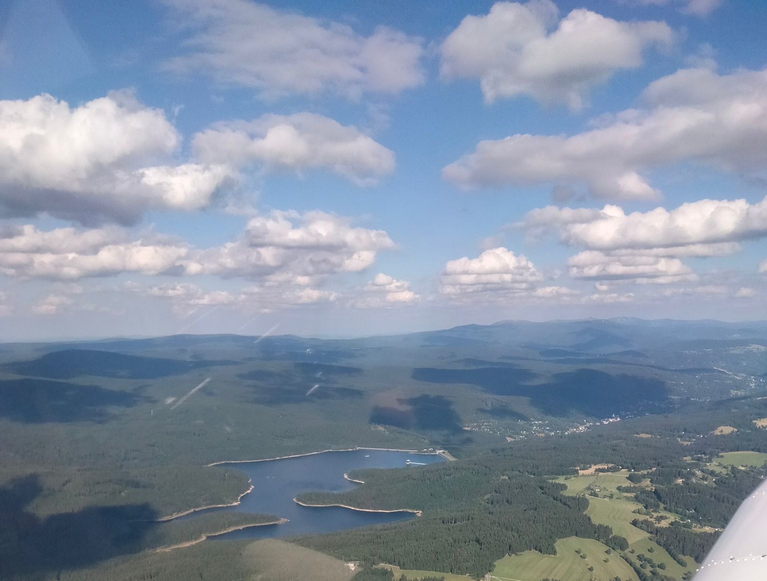 Owej soboty start i lot do punktu granicznego TOMTI przebiegał bez najmniejszego problemu. W dolocie do TOMTI pojawiła się pierwsza nieprzyjemna niespodzianka. Nad Sudetami zawisła wielka, ciemna chmura. Przerwa pomiędzy szczytami a chmurą z pewnością spełniała minima. Jednak mój pierwszy przelot nad pasmem górskim planowałem z dużym zapasem wysokościowym i komfortem psychicznym. Na szczęście widziałem, że po czeskiej stronie świeci słońce więc się “przecisnąłem”.
